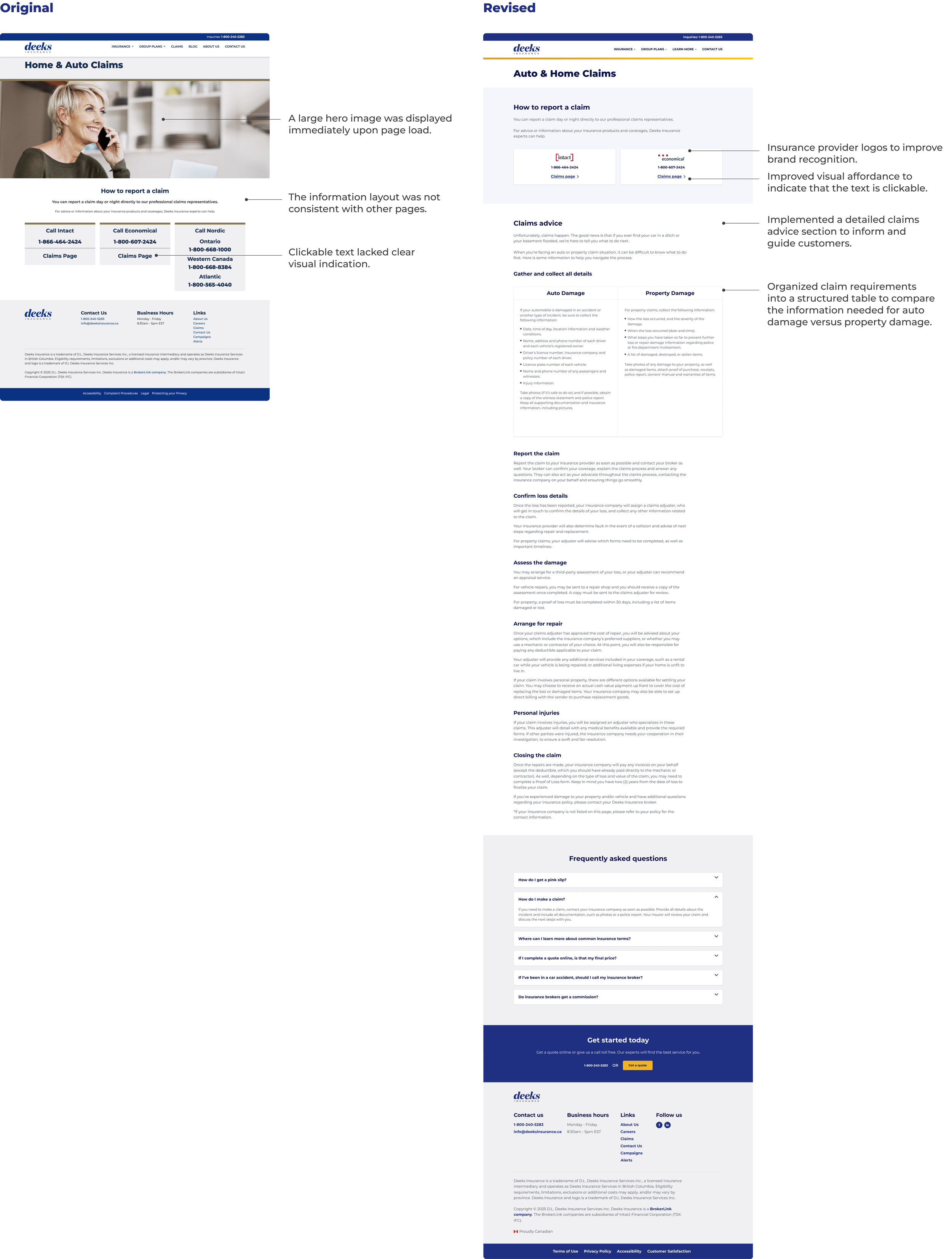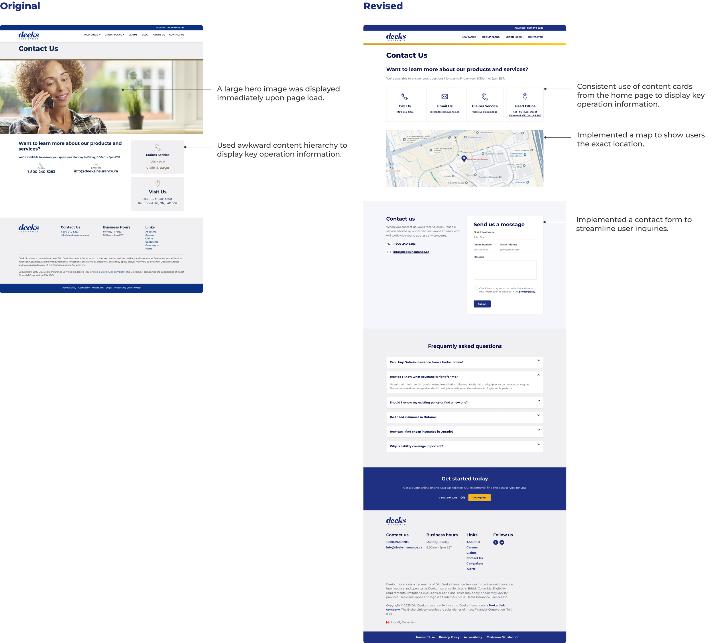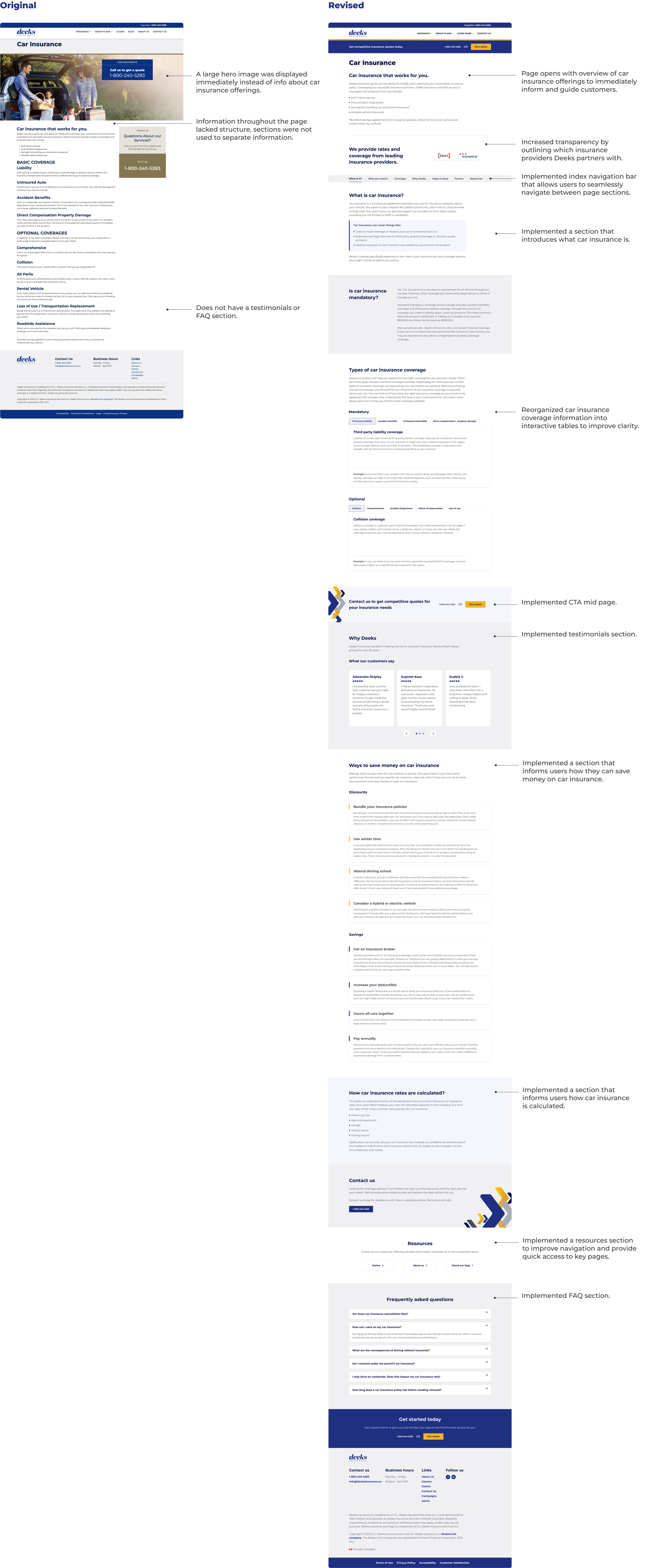 During my internship at BrokerLink, I led the redesign of the Deeks Insurance website to modernize its digital presence and improve usability. There were no existing design files or structured system for the website in Figma. Therefore, I was responsible for building and maintaining the design system while redesigning the experience. I focused on creating a more intuitive and cohesive platform aligned with brand and accessibility standards.Project Overview