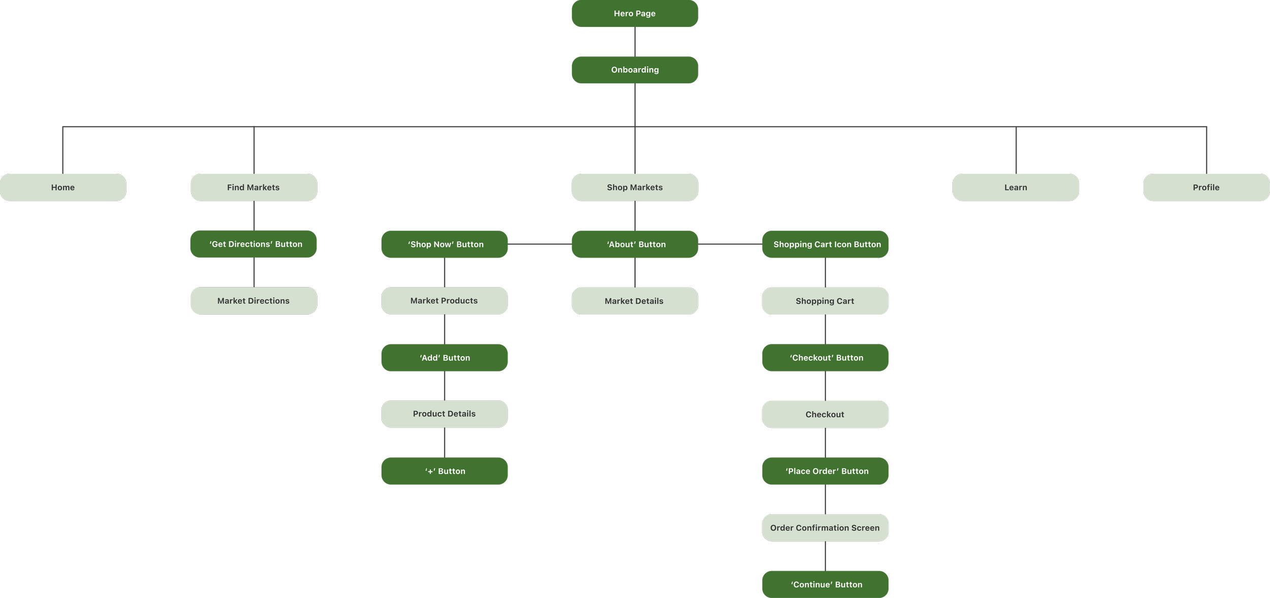 I designed the platform around key navigation sections. The homepage leads to 'Find' for nearby markets, 'Shop' for local groceries, 'Learn' for educational content, and 'Profile' for orders and favourites. This structure ensures convenience, discovery, and a personalized experience.Information Architecture