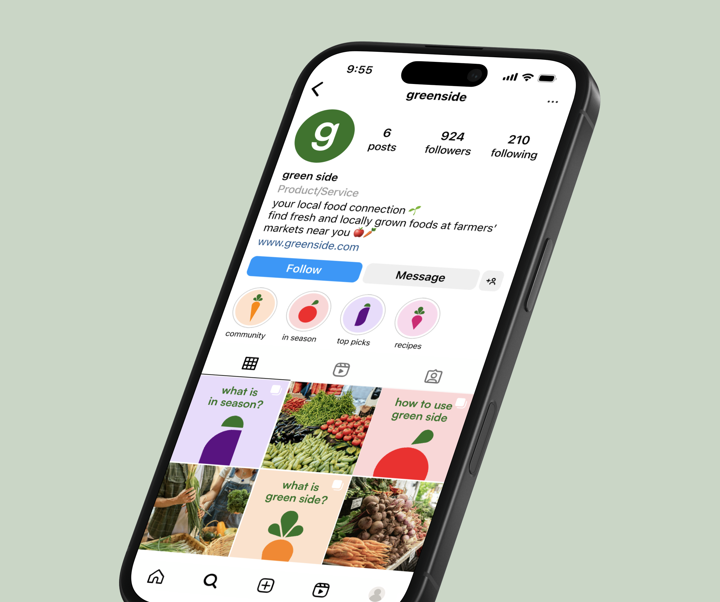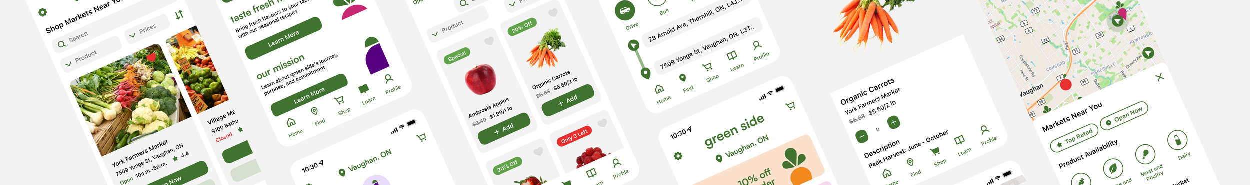 Green Side keeps users in the know about what’s in season to ensure enjoyment of the freshest foods available through the 'Learn' section, featuring a produce guide, farmer stories, and seasonal recipes. The 'Profile' section is where users can track current orders, browse order history, and quickly access their saved markets and products.