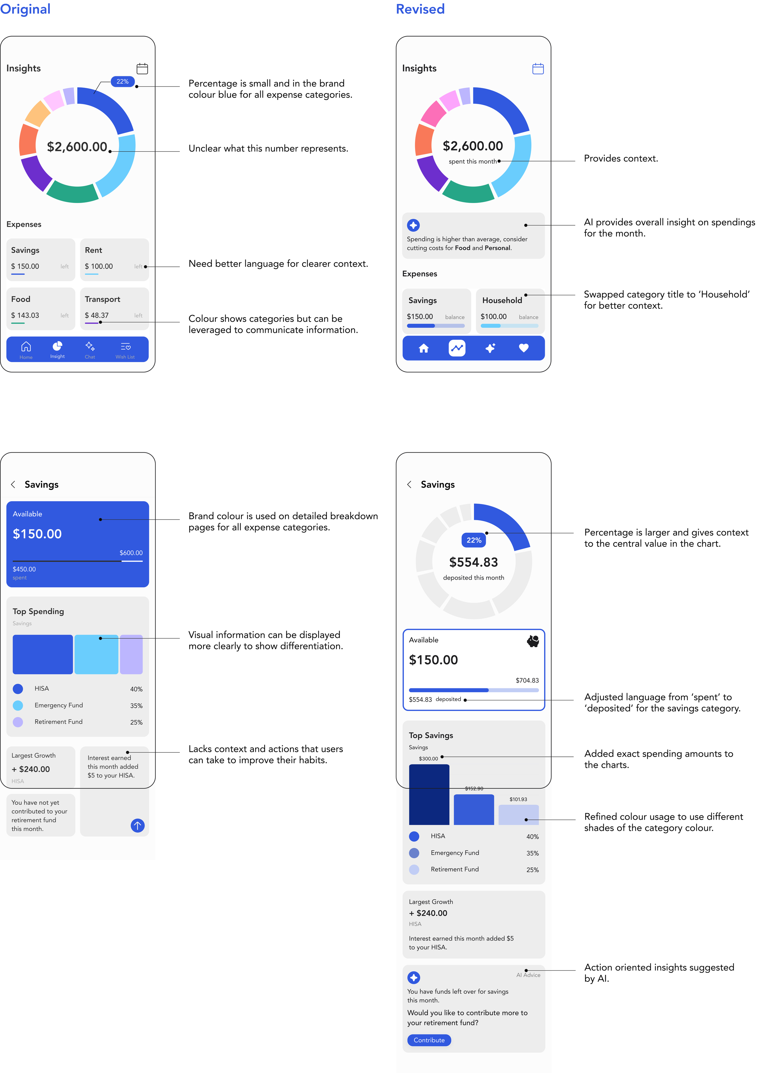 Working on the revision of a mobile app that was handed-off to our team allowed me to strengthen my skills for how to evaluate an existing product with a critical eye, identify gaps in UX, and introduce new features that seamlessly fit in with the established product and design system. I learned how to strengthen usability while maintaining consistency with the original product vision.